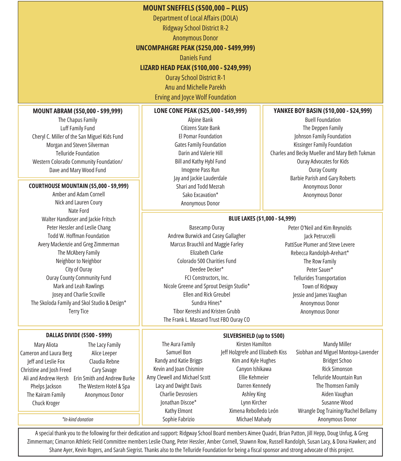 Your donation will go to the Cimarron Athletic Field facility maintenance fund set up by the Ridgway School District.